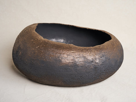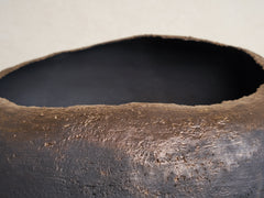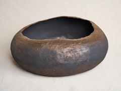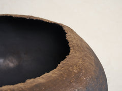 Poetry in the contrast of the strength of the stoneware once fired which comes from this smooth, soft, fragile material which is the clay at its beginning. Those pieces interpreting the relationship between the primal nature of the golden, incandescent and malleable Lava which turns into a strong, textured, dark Volcanic Rock set by the air temperature. This primal material transition is at the beginning of a new land.