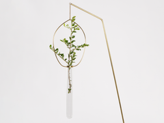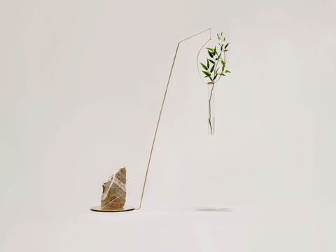 Eden is constructed of glass tubes and handcrafted solid brass components. The weight comes form a raw piece of marble that rests on the base. The lightness of these simple elements highlights the beauty of the flowers and leaves, which truly complete the design. Gently swinging by air currents, Eden becomes a gracious presence in a room.