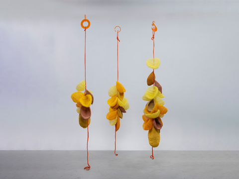 For the past 28 years, Leslie Pontz work has been with fiber. She started to crochet 3-dimensional pieces around the turn of the century, and did not look back. Her love the simple process from which she can make very complicated works is what inspires her. The art has both a feminine and masculine character, emphasized by the use of the hard and soft material combinations. The work is all hand crocheted, one stitch at a time, using a variety of materials, such as monofilament, wire, silk, cotton, hemp. And these fiber forms are usually combined with other materials such as iron, wood, and plexiglass. It is a labor-intensive process, and each piece takes time.