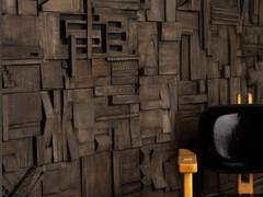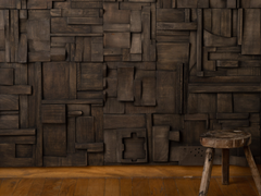 Collage tiles are modular panels composed randomly from wood remnants and sanded to a soft finish, protected with lacquer and wax. They bring the viewer in with a chaotic intensity but convey a meditative feeling, a calm pleasure as the eye moves through a field of wood that conveys action. The tiles are as much an architectural material as they are artwork, wrapping the space with warmth and texture.
