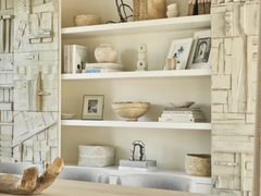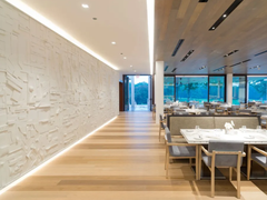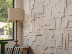 Collage tiles are modular panels composed randomly from wood remnants and sanded to a soft finish, protected with lacquer and wax. They bring the viewer in with a chaotic intensity but convey a meditative feeling, a calm pleasure as the eye moves through a field of wood that conveys action. The tiles are as much an architectural material as they are artwork, wrapping the space with warmth and texture.