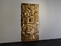 Collage tiles are modular panels composed randomly from wood remnants and sanded to a soft finish, protected with lacquer and wax. They bring the viewer in with a chaotic intensity but convey a meditative feeling, a calm pleasure as the eye moves through a field of wood that conveys action. The tiles are as much an architectural material as they are artwork, wrapping the space with warmth and texture.