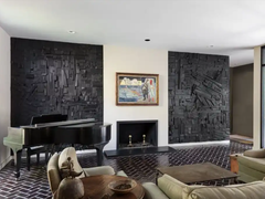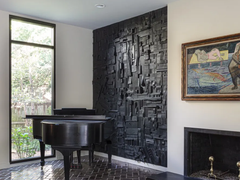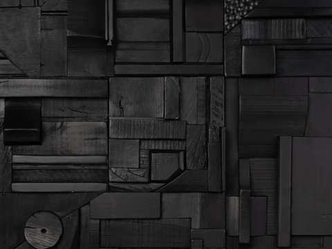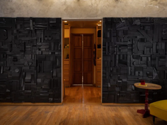 Collage tiles are modular panels composed randomly from wood remnants and sanded to a soft finish, protected with lacquer and wax. They bring the viewer in with a chaotic intensity but convey a meditative feeling, a calm pleasure as the eye moves through a field of wood that conveys action. The tiles are as much an architectural material as they are artwork, wrapping the space with warmth and texture.