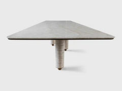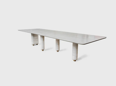 honed Taj Mahal marble table top, marble ringed base, brass details