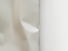 Made of inflated stainless steel - a technique of which the results are always unpredictable-it takes the shape of a cushion. Storms inflates sheet metal against a piece of stone, and thereby transforms it into a three-dimensional shape which echoes the shape of the stone. This process not only changes the look, but also the structural properties of the metal.