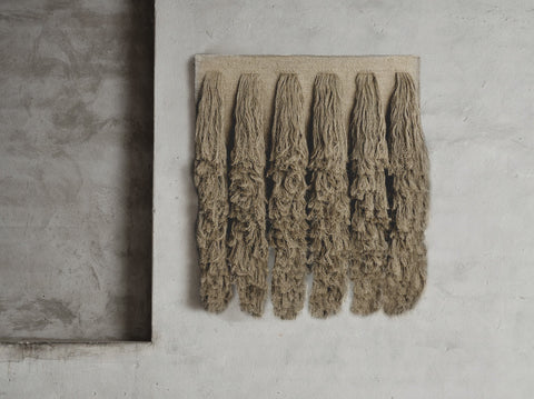 The piece is hung using Sheesham wood planks, inserted in pockets on the flat weaved backing. Sheesham, one of the most durable and sustainable woods, is a native to India, where the tapestries are handcrafted.