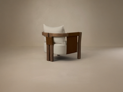 Saddle; cushions clad in a linen composite renowned for its durable properties are suspended in a stain proof leather sling uniting solid walnut legs. Handcrafted by artisans who share a meticulous devotion to proportion and comfort.
