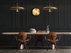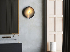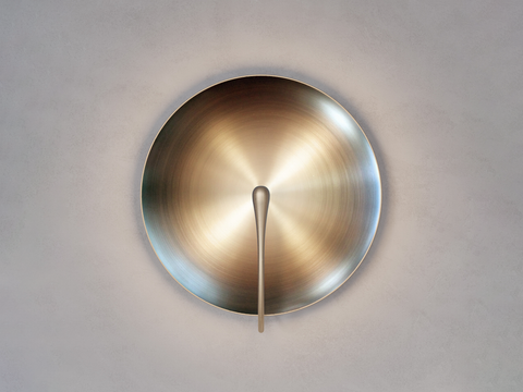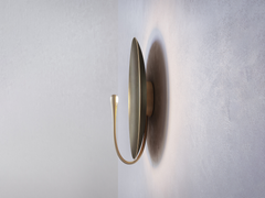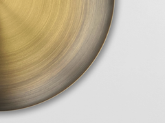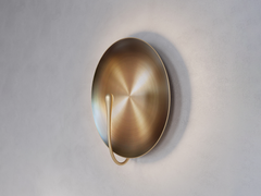 A gentle silhouette of a plate makes up this unique wall light. To create this orbital, gradient-finished shade, a mixed patina is applied on a hand-spun brass plate, from dark bronze to bright brushed brass, to accentuate the light effect. Softly illuminated with integrated LED from within.
