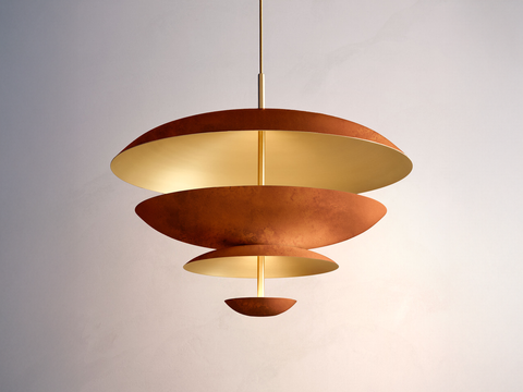 Composed of four carefully hand-spun brass plates, the light is projected into the shade and reflects out, illuminating without creating a glare.
