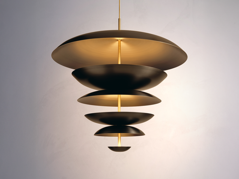 The Cosmic Chandelier XL is composed of six carefully hand-spun brass plates. This handmade pendant provides both uplight and downlight, illuminating space without creating glare.