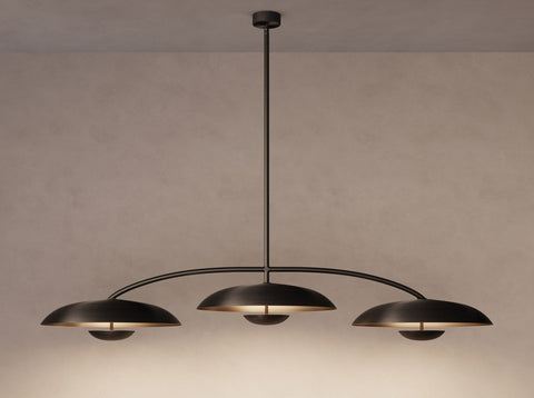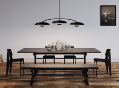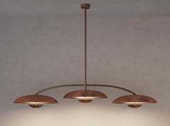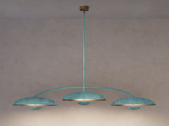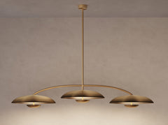 Trio for three, a unique ceiling light composed by a cluster of lighting components. Combining patinated brass plates and finely brushed bronze framework, the Orbit Trio ceiling light is softly illuminated with LED elements from within.
