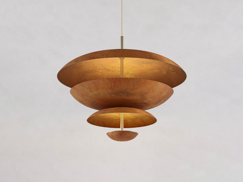 Finely hand-spun brass plates make up this pendant light, finished in a mixed patina. One side is dark end color bronze and the other a gently brushed brass gradient. The light is projected into the shade and reflects out, illuminating without creating a glare. It is softly illuminated with LED lighting technology.