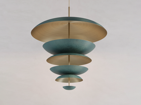 The Verdigris Chandelier XL is inspired by the beautiful textures found within nature. A mixed verdigris patina is applied onto six hand-spun brass plates to create this unique chandelier.