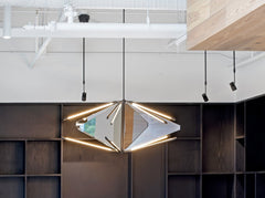 Echo uses mirrored fins, radiating from a central axis, to reflect beams of light. LED tubes are turned inward to bounce off the mirror, thereby softening and amplifying that light. Echo is also available with glass fins, which diffuse the light, creating a soft glow.