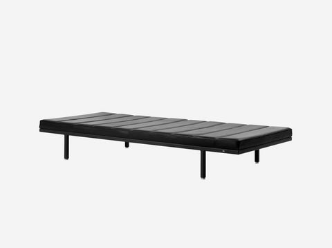 With an aniline leather mattress resting on a black powder-coated steel frame, the Vipp daybed is an exclusive resting spot or seating option for the living room or office space. The black leather upholstery features unique visual characteristics.