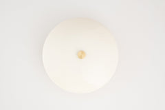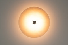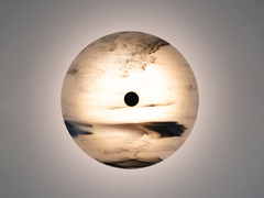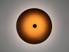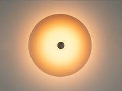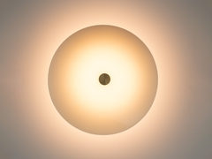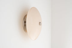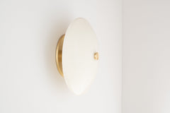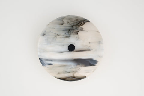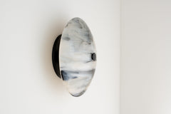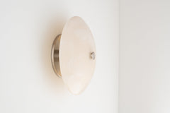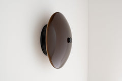 A modern dome of hand poured and slumped glass floats effortlessly off the wall providing distinct dimmable illumination.