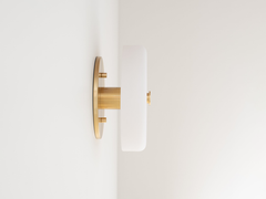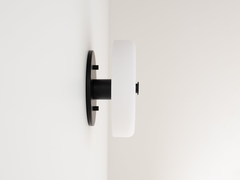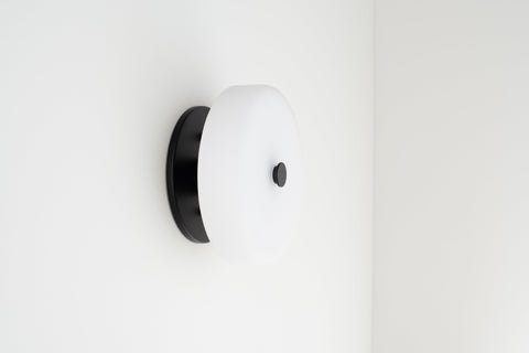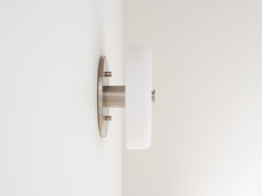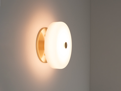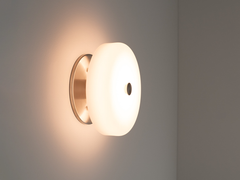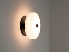 A modern hand-blown glass disc floats effortlessly off the wall providing distinct dimmable illumination.