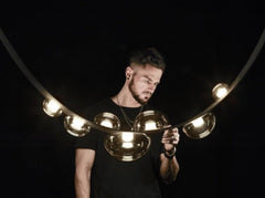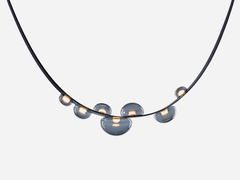Dew drops sparkling on a thin blade of grass expose the elemental beauty of nature that continues to fascinate us. The intimately familiar, yet still charming, shape of dew drops inspired this collection with its precise details. Lit by an internal light source offering an exceptional esthetic experience, the crystal objects, with hints of iridescence, adhere tightly to hand-sewn bands from an innovative material.