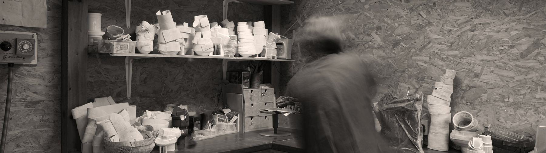 Bronwen Grieves has been developing and refining her ideas and process over a 30 year period. Her works strive to balance structure with fluidity, using organic and inorganic forms as a reference point. Largely self-taught, she builds and fires all her work in her garden studio in Nottingham. Her work is informed by her extensive collection of mid-century modernist objects and her passion for gardening. She builds her pieces using grogged stoneware primarily in black and white; glaze is used sparingly, often limited to slips which are partially rubbed away to reveal the texture and colour beneath.