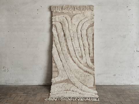 Colonnade no.01 has a soft irregular pattern that creates a vivid and intriguing feel. The rug is crafted in natural and unbleached wool in a soft shell-white high pile and sandy colored backing. Its long fringe-edge elevates the look and adds and artistic detail.