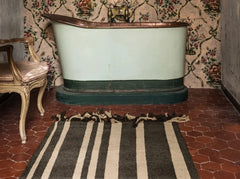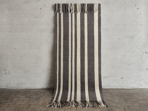 Colonnade no.05 is a hand-knotted low pile rug. The soft contrast between the dark brown/grey and sandy beige creates an eclectic and bold signature piece for hallways and narrow spaces. Adding long fringes elevates both end lines and adds an artistic detail.