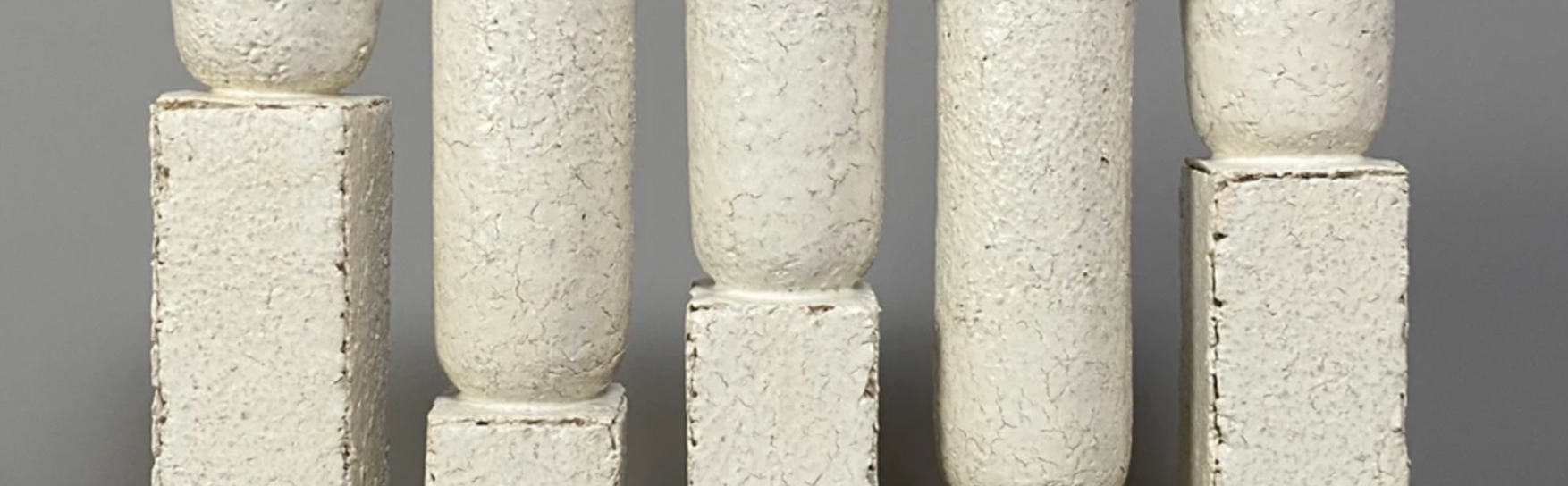 The slab built technique technique and the choice of stoneware with rough relief give her ceramics an architectural and archaic appearance.