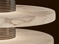 The translucent alabaster planes of the Median Series are intersected by a fluted brass form, referencing traditional Middle Eastern jewelry while pushing it through a futurist lens. The stone glows from a light source that remains hidden, illuminating the relationship between the solid and the permeable.