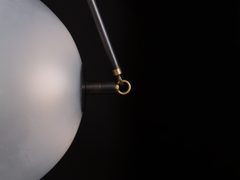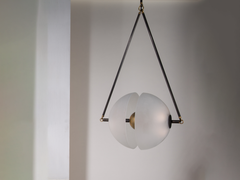 Inspired by the mechanics of neural synapses, this pendant is composed of two hand-molded glass domes that require a 4-art firing process. A brass orb floats in transit between the two hemispheres.