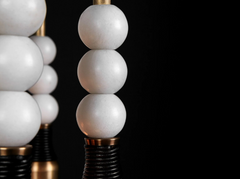 A strict arrangement of semi-precious stones recalls fine details found on statues at the ancient city of Persepolis. Agate, jasper, or jade beads are pierced by finely fluted pins, affixing them to a leather-bound brass structure.