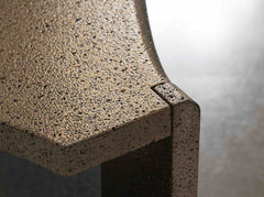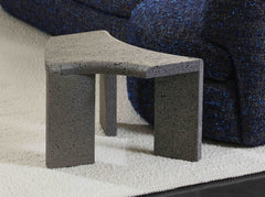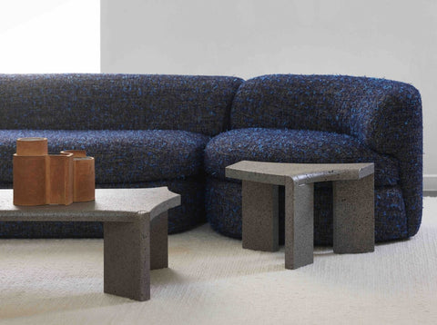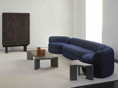 In volcanic lava stone from the Auvergne, LEY is composed of a side table, a coffee table and a low console table. With its alternating curves and crisp edges, raw and enameled finishes, LEY is like a radical, brutalist outpost that nonetheless nestles gracefully and quite naturally into the embrace of an armchair, highlighting the design of a sofa, or, as a low console table, creating a sculptural island of matter.