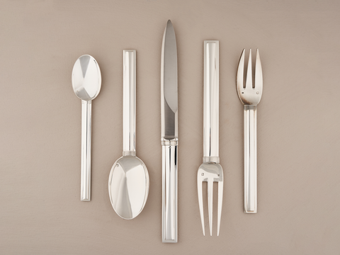 Cannes Collection, created by Jean Puiforcat in 1928, this sterling silver cutlery features five rings at the top of its fluted handle.  A icon for connoisseurs, this collection is renowned for the perfection of its architecture that evokes the facade of Hôtel Martinez in Cannes. Jean Puiforcat chose this collection for his own wedding.