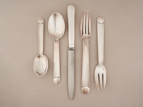 Designed in 1934, this flatware was chosen for one of the restaurants on the eponymous ocean liner that linked New York to Le Havre.  The pure forms and perfect geometry of this silver-plated model showcase Jean Puiforcat’s talent and make it a timeless design.