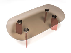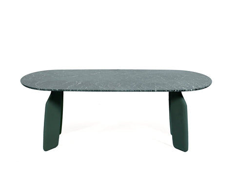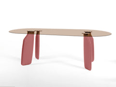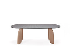 Bavaresk Oval is a conference/dining table with a glass or marble top and beech legs. The helm-shaped legs are milled out of multiply wood, and then lacquered or dressed in fabric or leather.