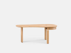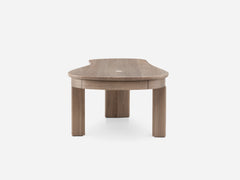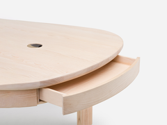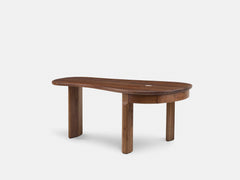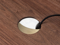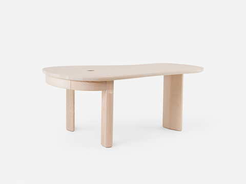 Twenty-Five Desk is a re-imagining of the typology, offering flexible seating with no front or back. Inspired by the work of Charlotte Perriand and the organic shape of gourds, the solid wood desk has been designed to take center stage in a room with its welcoming shape and tactile detailing. Comfort and hap-tic qualities were deeply considered in its creation, from the thick desktop and inviting edge profile to the solid wood legs. Twenty-Five Desk’s cable management system features a contrasting cover made in stone and brushed brass.