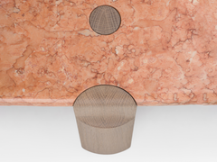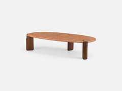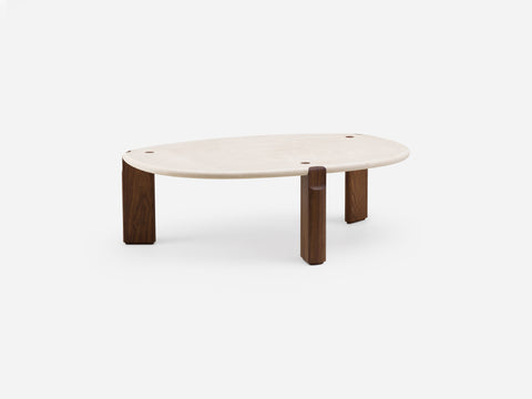Twenty-Five Coffee Tables are versatile and sculptural tables inspired by the phases of the moon. They have a soft, organic pebble shape and a rounded tabletop edge possessing an inviting tactility. Beautiful joinery where the timber leg intersects the marble tabletop celebrates the contrast of materials.