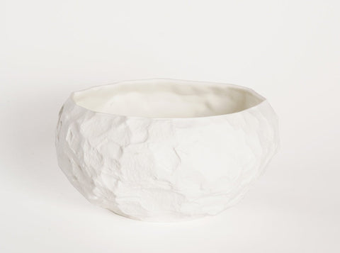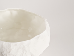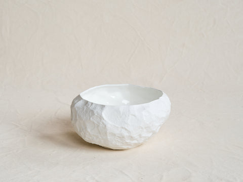 A collection of fine bone china tableware slip-cast from plaster models carved by hand, with glazed interior for functionality and raw exterior reflecting the modest surface texture of the plaster original.
