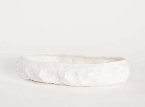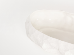 A collection of fine bone china tableware slip-cast from plaster models carved by hand, with glazed interior for functionality and raw exterior reflecting the modest surface texture of the plaster original.