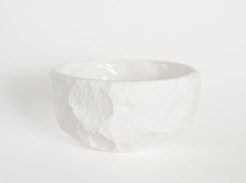 A collection of fine bone china tableware slip-cast from plaster models carved by hand, with glazed interior for functionality and raw exterior reflecting the modest surface texture of the plaster original.