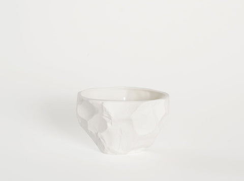 A collection of fine bone china tableware slip-cast from plaster models carved by hand, with glazed interior for functionality and raw exterior reflecting the modest surface texture of the plaster original.