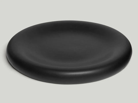 A stoneware platter for serving or display with a flat center and gently rounded edges. Designed by Faye Toogood as part of the Dough ceramics collection, named for the common ground of kneading in both baking and pottery. Hand-shaped in the Toogood studio in London before being cast in stoneware, the collection plays with rounded, swelling forms evocative of rising dough.