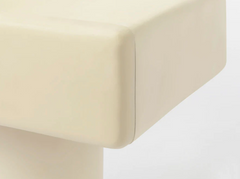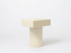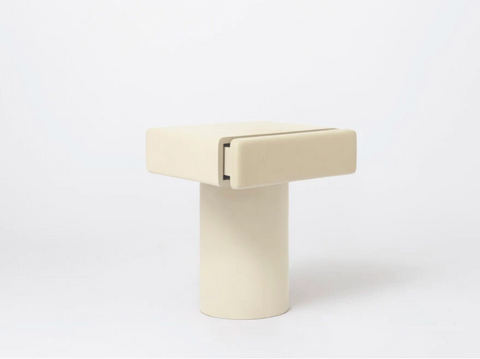 A freestanding bedside table with a flush sliding drawer. A chamfered storage unit stands atop a single stout column.