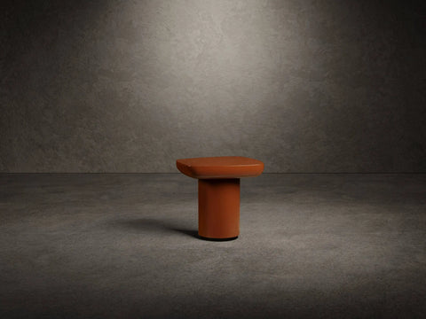 solid wood top, lacquered curved wood cylinder, matte black painted wood plinth