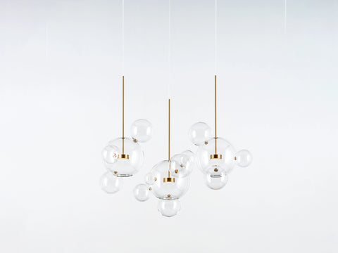 The lightness of the soap bubbles has become a metaphor for the immateriality of light. Bolle is a collection of lamps in transparent glass, where the illuminating brass bulb is suspending between the spheres, giving light to not only the space but also the curved surfaces, multiplying reflections to amplify the magical effect. The Bolle lamps are hand blown by local Venetian artisans using the “a lume” technique.