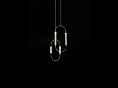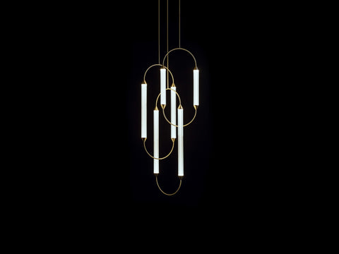 Lamps with slender thread-like structures in brushed brass, that change form to create infinite geometric compositions. The figure, suggesting circus gear, is interrupted by capsules that project continuous light. Each capsule, made in ribbed glass with extremities in brass, crafted with a lathe using a very refined technique that starts with a solid block of the material, conceals light guides used in the automotive sector that make it possible to connect the LEDs contained in the ends of the capsule, conducting the light along the entire length.