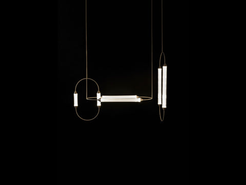 Lamps with slender thread-like structures in brushed brass, that change form to create infinite geometric compositions. The figure, suggesting circus gear, is interrupted by capsules that project continuous light. Each capsule, made in ribbed glass with extremities in brass, crafted with a lathe using a very refined technique that starts with a solid block of the material, conceals light guides used in the automotive sector that make it possible to connect the LEDs contained in the ends of the capsule, conducting the light along the entire length.