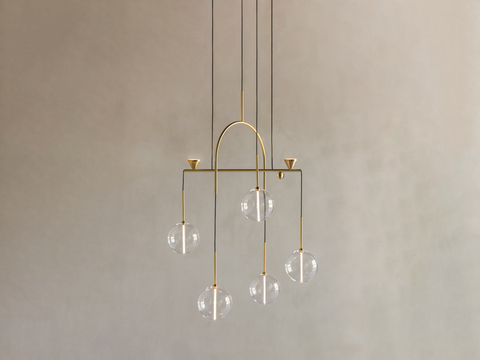 Simple dewdrops hanging from blades of grass, hit by the subtle moon light is the inspiration for the Dew Drops which led Cristiana and Christopher to develop a balancing mobile lighting structure which suspends dewdrops in the night. The soft light of the dew drops are supported by an indirect light, emitted upwards by two spotlights, hidden within the brass cones.