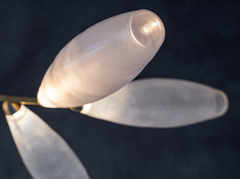Two sidereal collections are born from an imaginary journey To the Moon and Back. One is Gem, which is inspired by material purity and the magnetic force that envelops us as we walk on the lunar surface. Made of stardust, soft and elongated gems are created in linear, circular, and vertical compositions, like crystal sculptures. The glass elements, as elongated gems, can be created with two particular finishes: the corroded, a slightly rough satin that recalls the rocky materiality of the lunar surface, and the mist, a white-nuanced one. Each element with its slightly irregular surface to the touch is different from one another because it is hand-blown, to keep the organic and pure feature of glass.