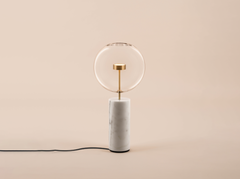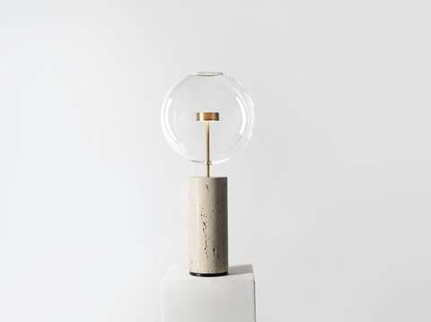 hand blown transparent borosilicate glass, Italian marble, and hand finished or electroplated brass
