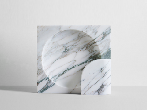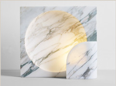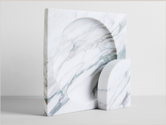 The Block Sconce in Calacatta Marble is a two piece stone light with captured bulb. Concealed mounting plate fixes the front and back pieces together.