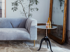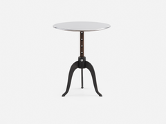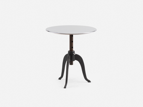 Sidekicks Height Adjustable Table is available with cast iron legs that allow the polished aluminum tabletop to be raised to five different heights.